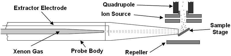 - Focuses those ions and atoms through the gun onto a liquid surface.