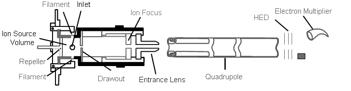 The filament is the source of electrons. A repeller is used to help direct ions through a series of lenses in the ion source. Without these components, sample molecules would not be ionized and they would not reach the mass filter.